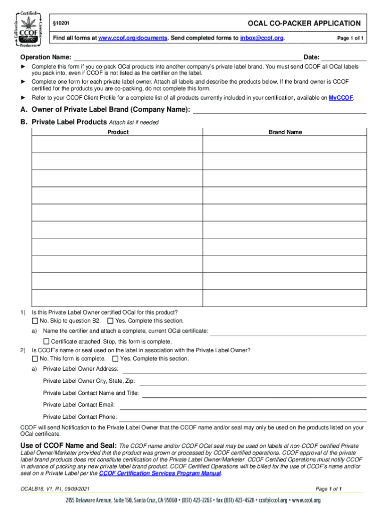 Get the free What do I need to send to CCOF if I co-pack products for ...
