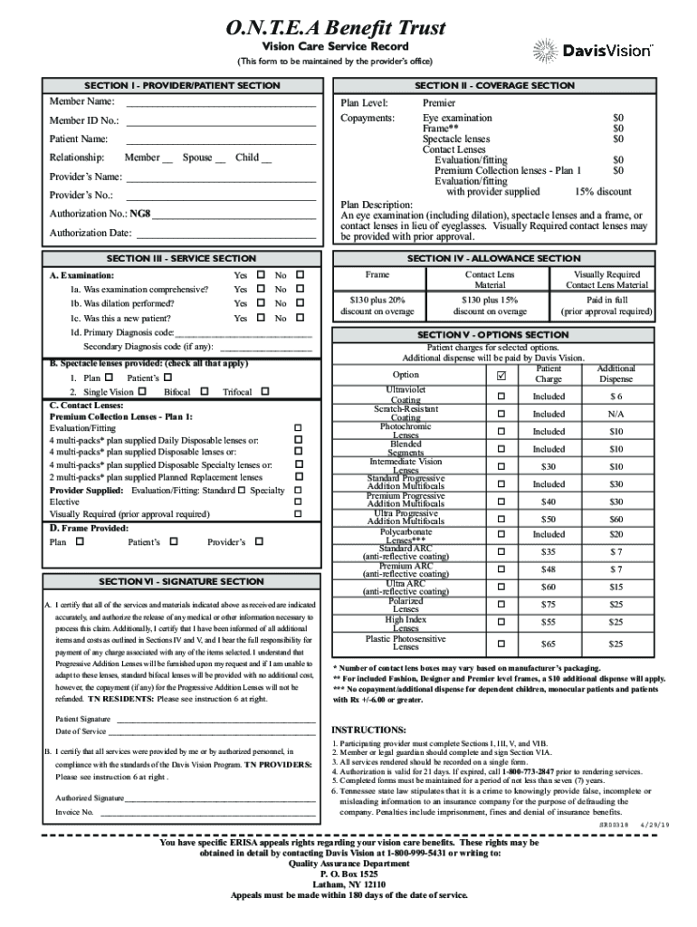 O.N.T.E.A Benefit Trust Vision Care Service Record(This form to be maintained by the providers' office) SECTION I PROVIDER/PATIENT SECTIONMember Name:SECTION II COVERAGE SECTION___Member ID No.: ___
