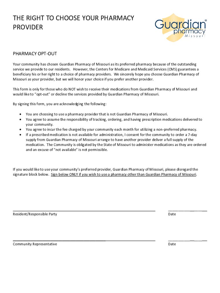 THE RIGHT TO CHOOSE YOUR PHARMACY PROVIDERPHARMACY OPT-OUT Your community has chosen Guardian Pharmacy of Missouri as its preferred pharmacy because of the outstanding service we provide to our residents.