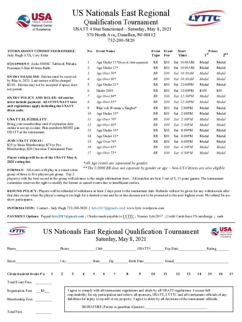 US Nationals East Regional Qualification Tournament US ATT 4 Star Sanctioned Saturday, May 8, 2021 370 North Ave, Ellen, NJ 08812 7322005820 TOURNAMENT COMMITTEE/REFEREE: Judy Hugh (CU), Cory Eider