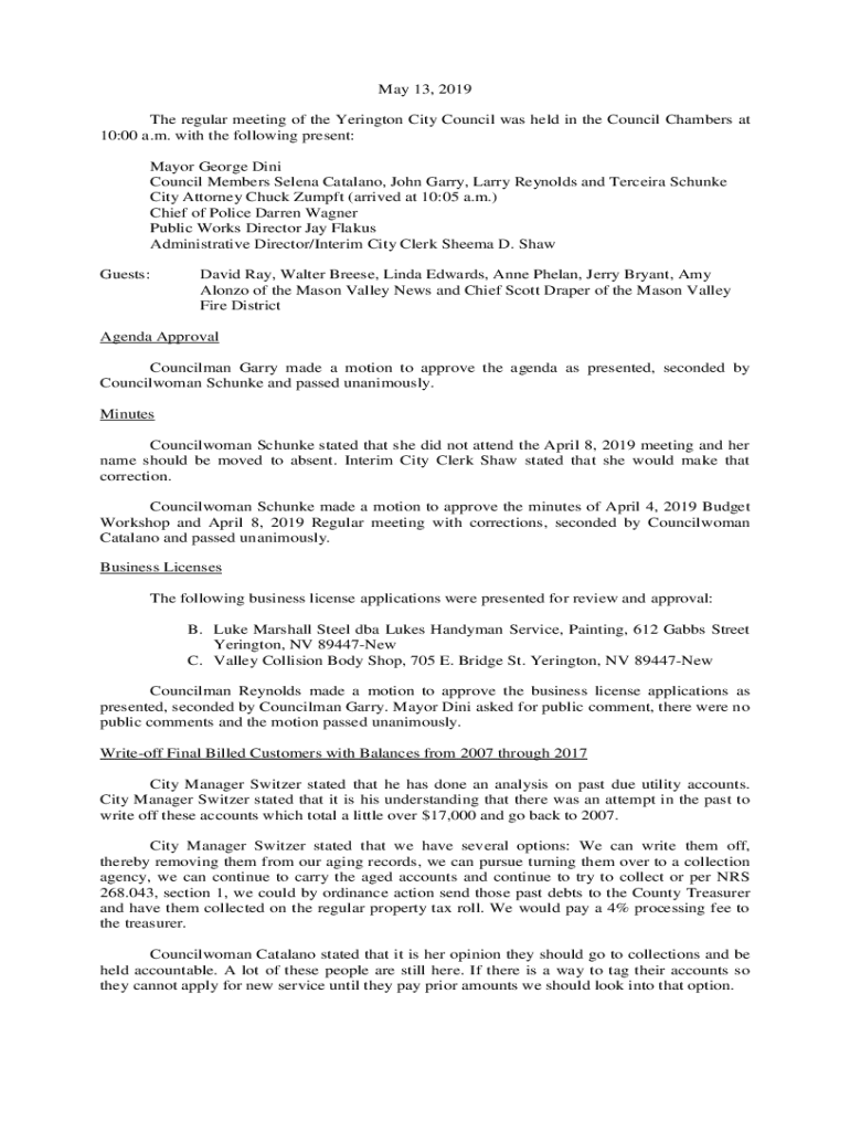 May 13, 2019, The regular meeting of the Lexington City Council was held in the Council Chambers at 10:00 a.m. with the following present: Mayor George Mini Council Members Selena Catalan, John Garry,