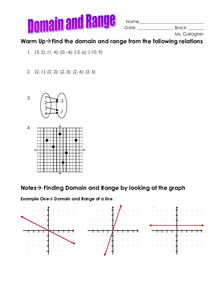 Name___ Date: ___ Block: ___ Ms. GallagherWarm Upwind the domain and range from the following relations 1. (3, 2); (1, 4); (0, 4); (2, 6); (10, 9)2. (2, 1); (2, 2); (2, 3); (2, 4); (2, 5)1 2 3 43.3