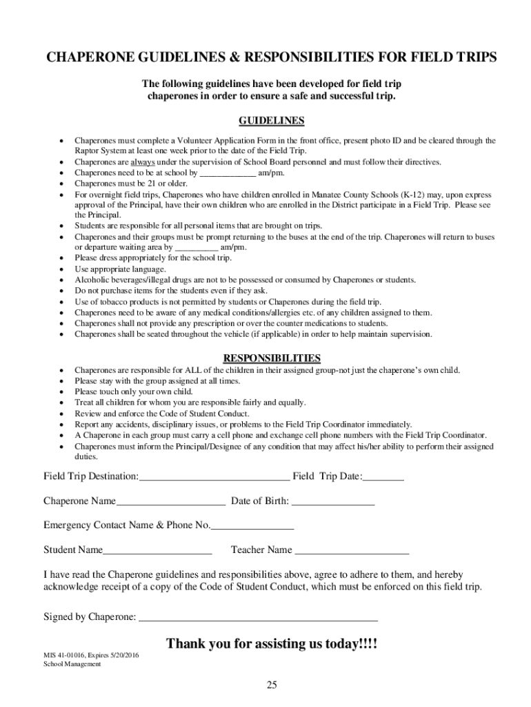 CHAPERONE GUIDELINES & RESPONSIBILITIES FOR FIELD TRIPS The following guidelines have been developed for field trip chaperones in order to ensure a safe and successful trip. GUIDELINES Chaperones
