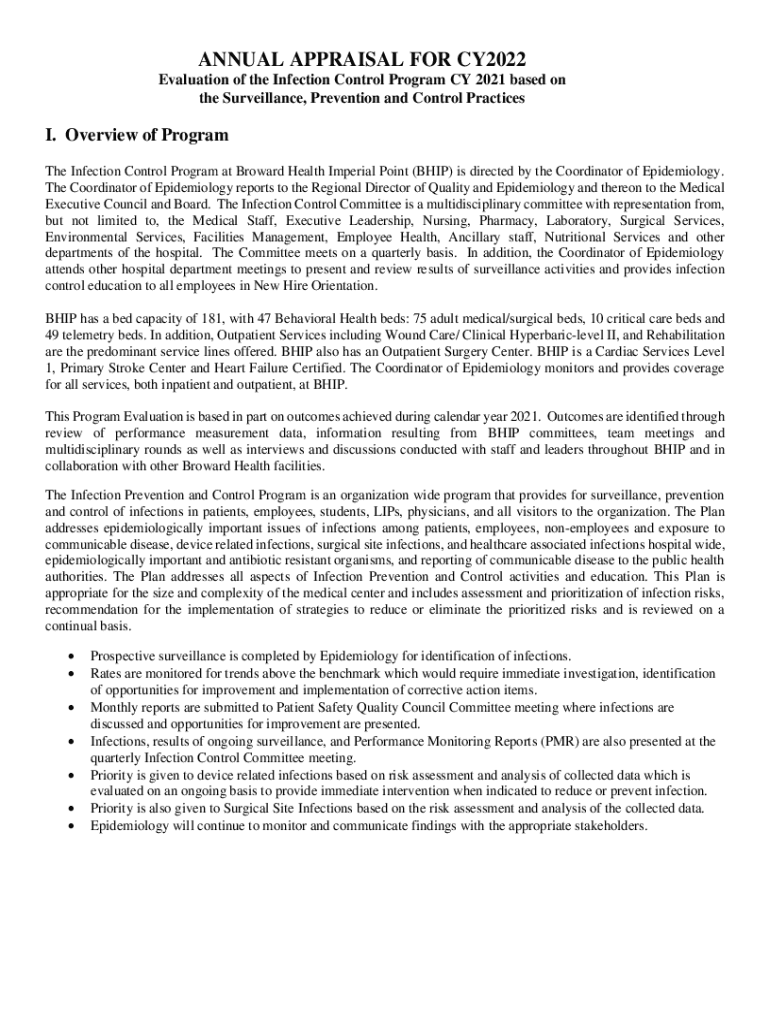 ANNUAL APPRAISAL FOR CY2022 Evaluation of the Infection Control Program CY 2021 based on the Surveillance, Prevention and Control Practices. Overview of Program The Infection Control Program at Broward