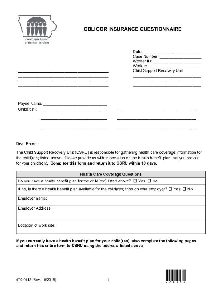 OBLIGED INSURANCE QUESTIONNAIREDate: ___ Case Number: ___ Worker ID: ___ Worker: ___ Child Support Recovery Unit ___ ___ ______ ___ ___ ___Payee Name: ___ Child(men): __________________Dear Parent: