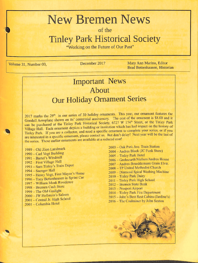 \” Working on the Future of Our Past\” Mary Ann Marino, Editor December 2017Volume 31, Number 03,Brad Bettenhausen, HistorianImportant News