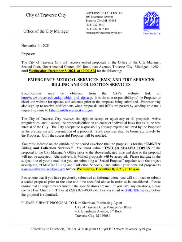City of Traverse City Office of the City ManagerGOVERNMENTAL CENTER 400 Boardman Avenue Traverse City, MI 49684 (231) 9224440 (231) 9224476 fax tcmanage@traversecitymi.govNovember 11, 2021 Proposer: