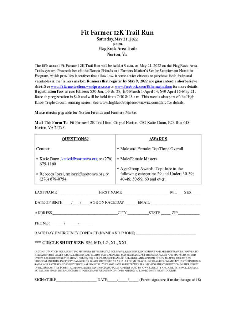 Fit Farmer 12K Trail Run Saturday, May 21, 2022 9 a.m. Flag Rock Area Trails Norton, Va. The fifth annual Fit Farmer 12K Trail Run will be held at 9 a.m. on May 21, 2022, on the Flag Rock Area Trails