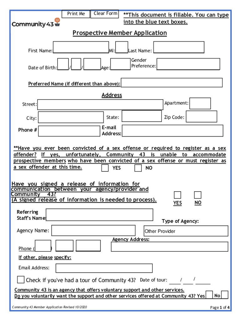 Print Declare Form**This document is fillable. You can type into the blue text boxes. Prospective Member Application First Name: Date of Birth:MI: //Last Name: Gender Preference:Age:Preferred Name