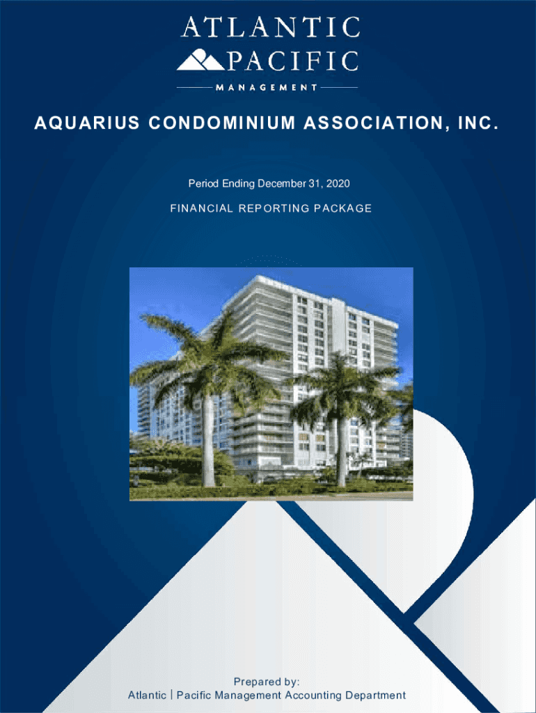 Information such as financial statements, annual budgets, meeting minutes, and any updates on the property must be reported on Aquarius Condominium Association Inc.