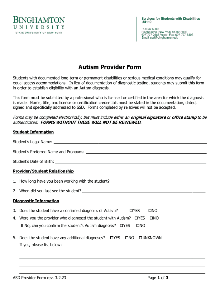 Services for Students with Disabilities UU119 PO Box 6000 Binghamton, New York 139026000 6077772686 Voice, Fax: 6077776893 Email: ssd@binghamton.eduAutism Provider Form Students with documented long