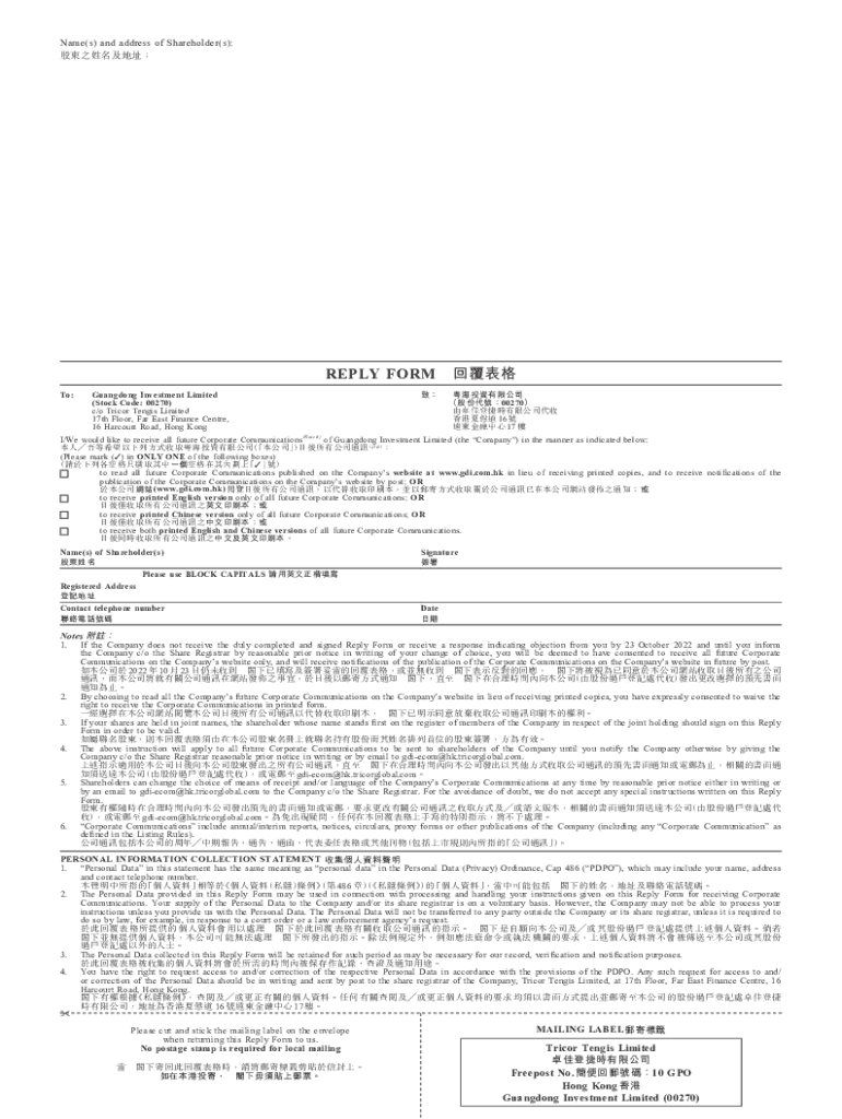 Name(s) and address of Shareholder(s):REPLY FORM To:Guangdong Investment Limited (Stock Code: 00270) c/o Tennis Limited 17th Floor, Far East Finance Center, 16 Harcourt Road, Hong Kong00270 1617I/We