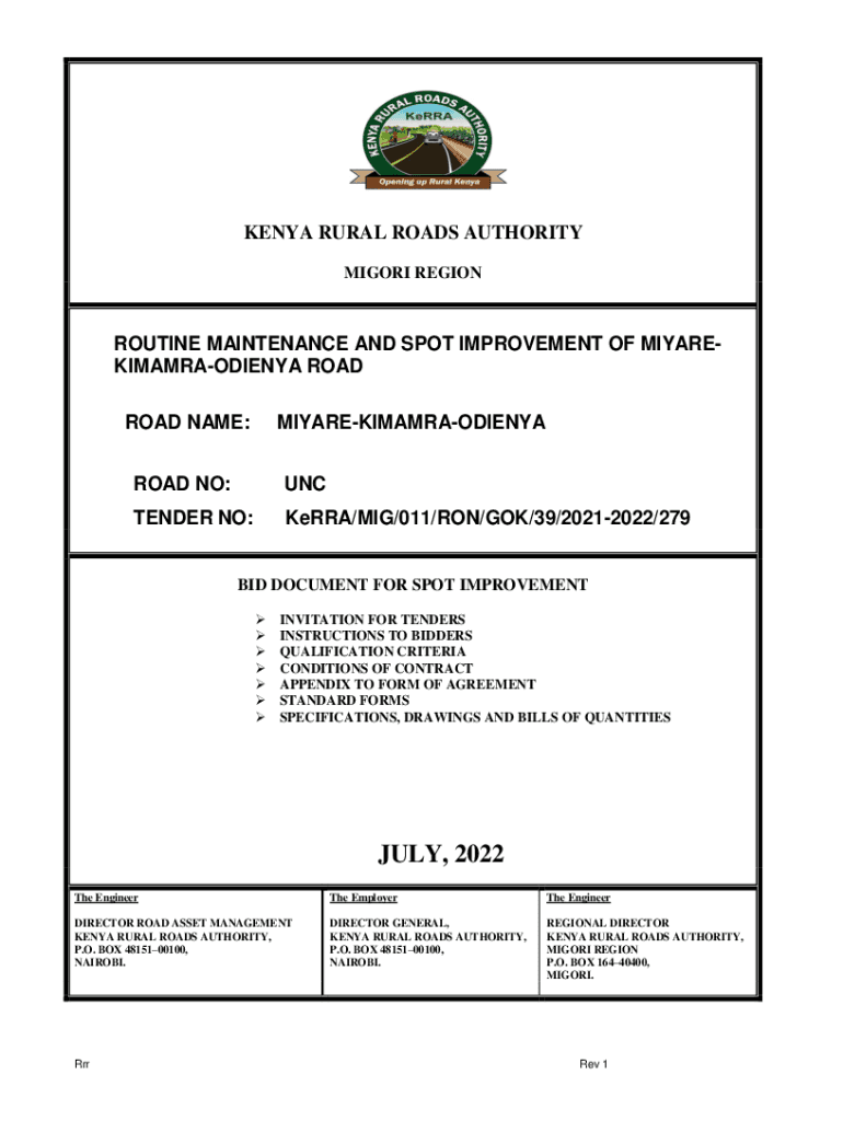 MIG ORI REGIONROUTINE MAINTENANCE AND SPOT IMPROVEMENT OF MIYAREKIMAMRAODIENYA ROAD NAME:MIYAREKIMAMRAODIENYAROAD NO:UNTENDED NO:Kerry/MIG/011/RON/GO/39/20212022/279BID
