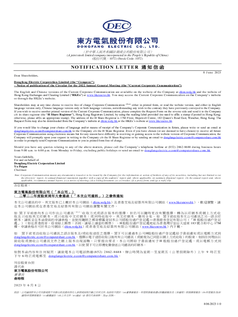 (A joint stock limited company incorporated in the Peoples Republic of China) (1072) (Stock Code: 1072)N O T I F I C AT I O N L E T T E R 8 J u n e 2023 Dear Shareholders, Dong fang Electric Corporation