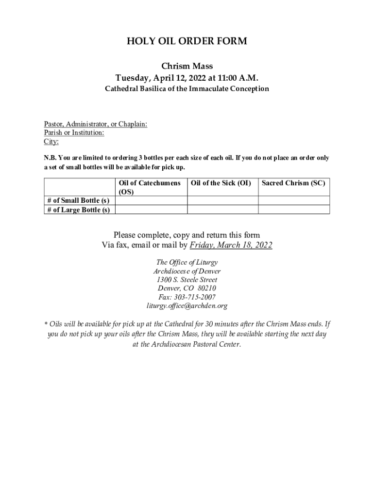 HOLY OIL ORDER FORM Chrism Mass Tuesday, April 12, 2022, at 11:00 A.M. Cathedral Basilica of the Immaculate ConceptionPastor, Administrator, or Chaplain: Parish or Institution: City: N.B. You are