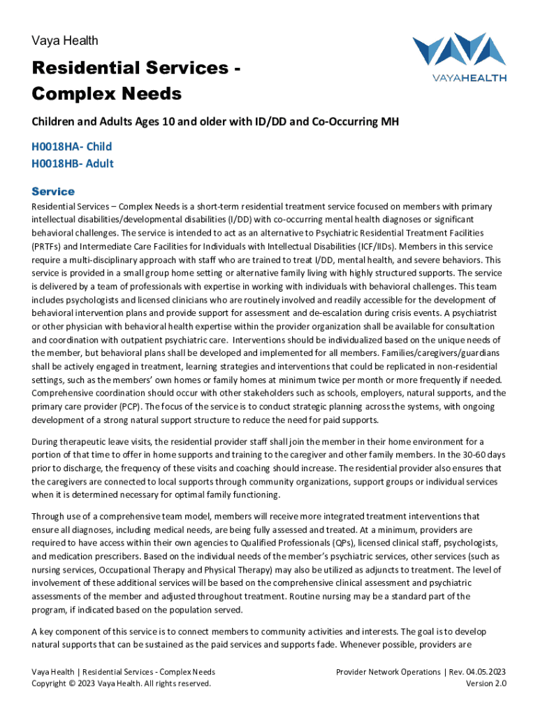 Maya HealthResidential Services Complex Needs Children and Adults Ages 10 and older with ID/DD and Occurring MH H0018HA Child H0018HB Adult Service Residential Services Complex Needs is a short term