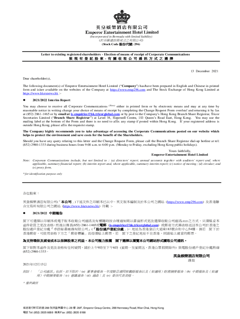 (Incorporated in Bermuda with limited liability) () (Stock Code : 296)Letter to existing registered shareholders Election of means of receipt of Corporate Communications 13 December 2021 Dear shareholder(s),
