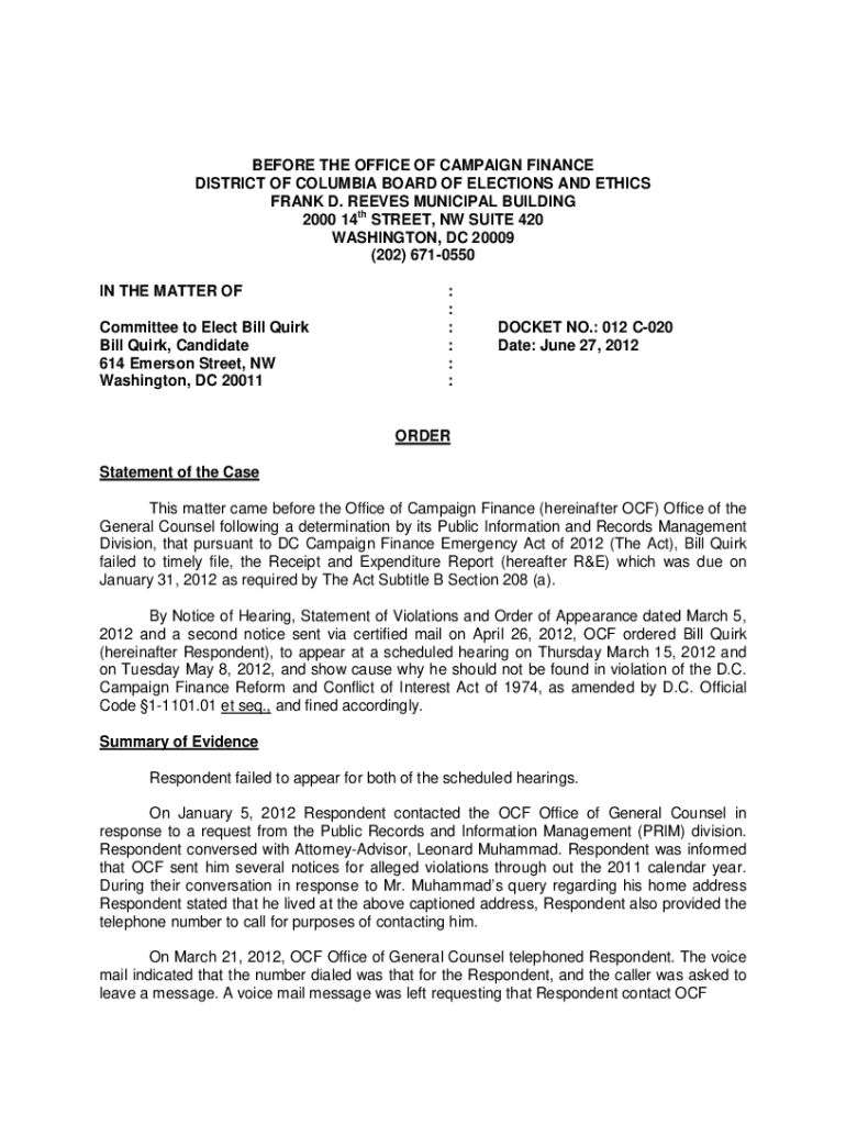 BEFORE THE OFFICE OF CAMPAIGN FINANCE DISTRICT OF COLUMBIA BOARD OF ELECTIONS AND ETHICS FRANK D. REEVES MUNICIPAL BUILDING 2000 14th STREET, NW SUITE 420 WASHINGTON, DC 20009 (202) 6710550 IN THE