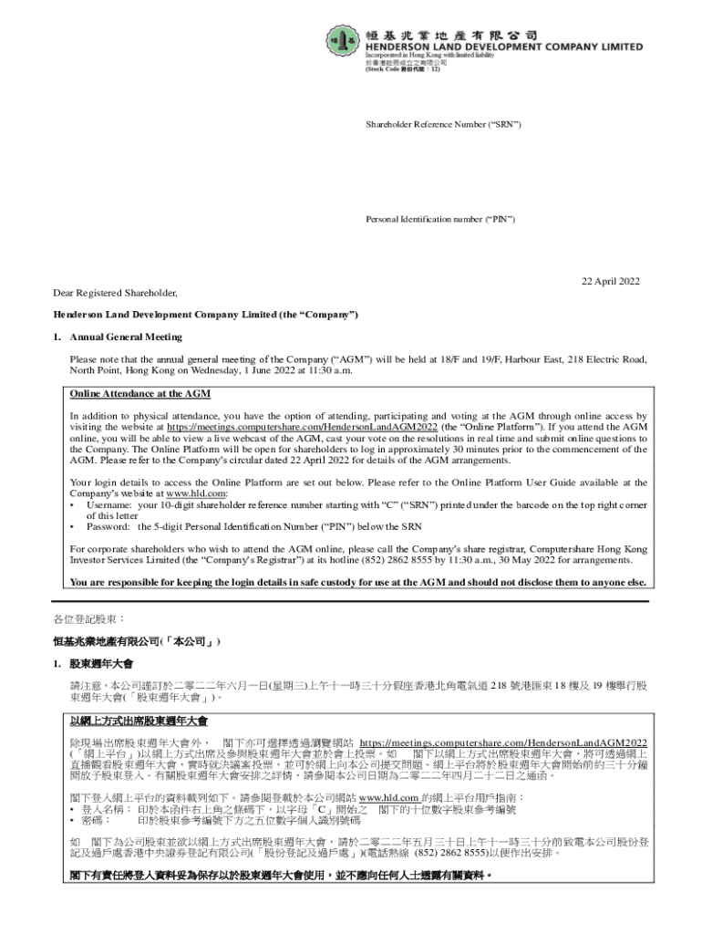 Shareholder Reference Number (SON)Personal Identification number (PIN)22 April 2022 Dear Registered Shareholder, Henderson Land Development Company Limited (the Company) 1. Annual General Meeting
