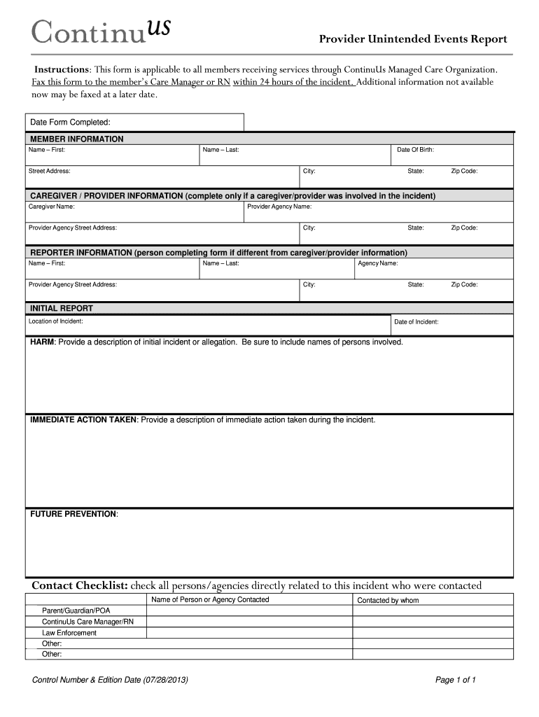 The Provider Unintended Events Report is a medical history form used by members of the ContinuUs Managed Care Organization to report incidents related to healthcare services.