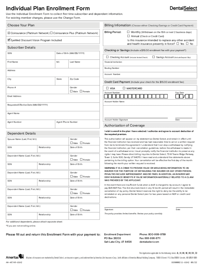 Individual Plan Enrollment Form Use the Individual Enrollment Form to collect first time subscriber and dependent information. For existing member changes, please use the Change Form. Choose Your