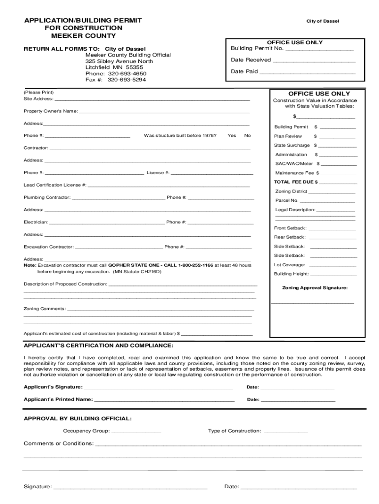 APPLICATION/BUILDING PERMIT FOR CONSTRUCTION MEEKER Countywide of DasselOFFICE USE ONLY Building Permit No. ___RETURN ALL FORMS TO: City of Damsel Meeker County Building Official 325 Bible Avenue