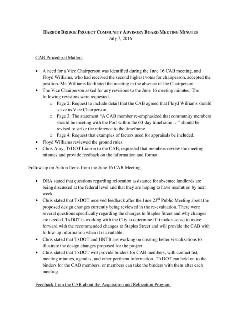 HARBOR BRIDGE PROJECT COMMUNITY ADVISORY BOARD MEETING MINUTES July 7, 2016CAB Procedural Matters A need for a Vice Chairperson was identified during the June 16 CAB meeting, and Floyd Williams, who