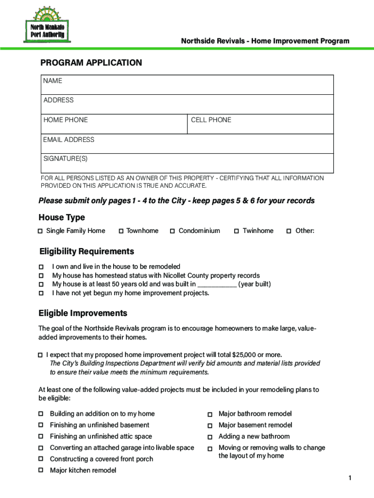Northside Revivals Home Improvement ProgramPROGRAM APPLICATION NAME ADDRESS HOME PHOTOCELL PHONEMIC ADDRESS SIGNATURE(S) FOR ALL PERSONS LISTED AS AN OWNER OF THIS PROPERTY CERTIFYING THAT ALL INFORMATION