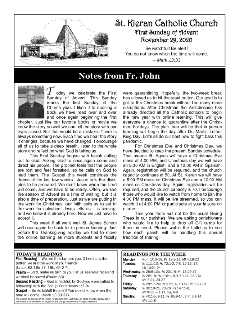 St. Kieran Catholic Church First Sunday of Advent November 29, 2020Be watchful! Be alert! You do not know when the time will come. Mark 13:33Notes from Fr. John Today we celebrate the First Sunday
