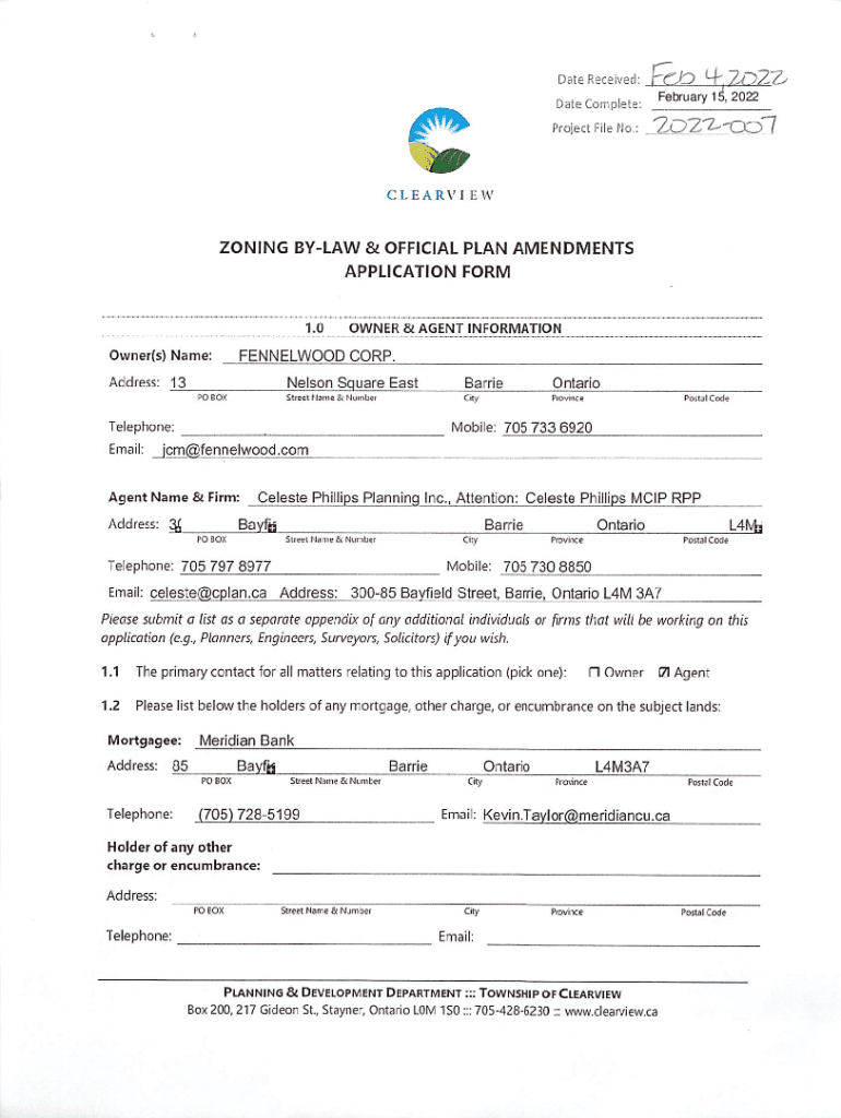 APPLICATION FORM1.0Owner(s) Name:OWNER & AGENT INFORMATIONFENNELWOOD