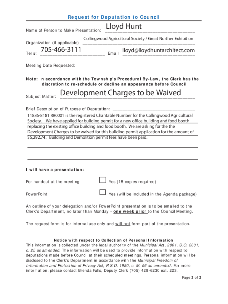 Request for Deputation to Council Lloyd Hostname of Person to Make Presentation: ___Collingwood Agricultural Society / Great Norther ExhibitionOrganization (if applicable): ___7054663111lloyd@lloydhuntarchitect.comTel
