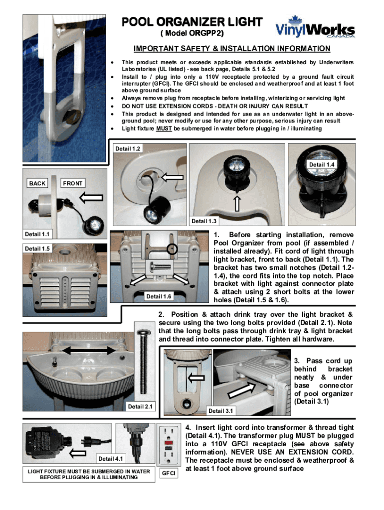 POOL ORGANIZER LIGHT (Model ORGPP2) IMPORTANT SAFETY & INSTALLATION INFORMATION This product meets or exceeds applicable standards established by Underwriters Laboratories (UL listed) see back page,