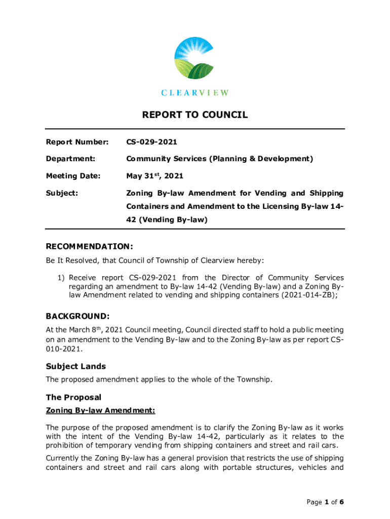 REPORT TO COUNCIL Report Number:CS0292021Department:Community Services (Planning & Development)Meeting Date:May 31st, 2021Subject:Zoning Bylaw Amendment for Vending and Shipping Containers and Amendment