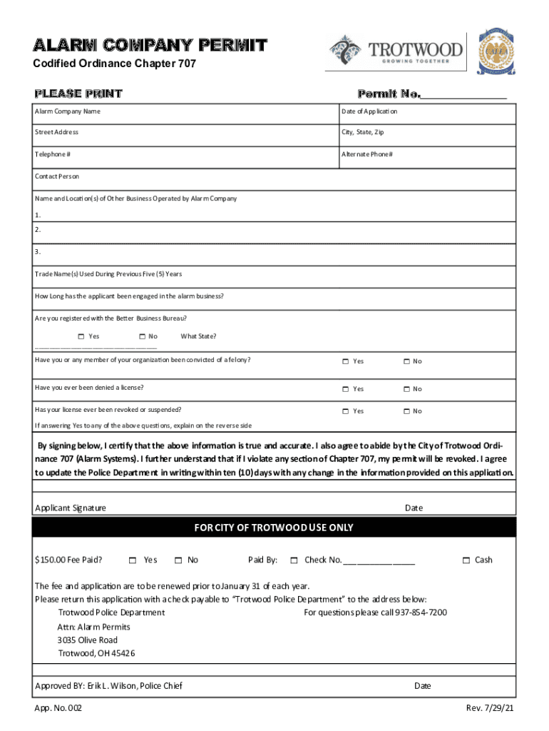 Codified Ordinance Chapter 707PLEASE PRINTPermit No.___Alarm Company Name Date of ApplicationStreet Addressing, State, Telephone #Alternate Phone#Contact Person