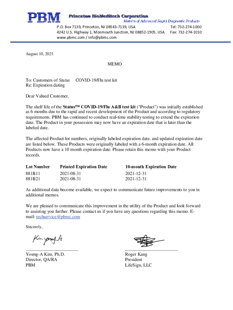 P.O. Box 7139, Princeton, NJ 085437139, USA 4242 U.S. Highway 1, Monmouth Junction, NJ 088521905, USA www.pbmc.com / info@pbmc.comTel: 7322741000 Fax: 7322741010August 10, 2021MEMO To: Customers of