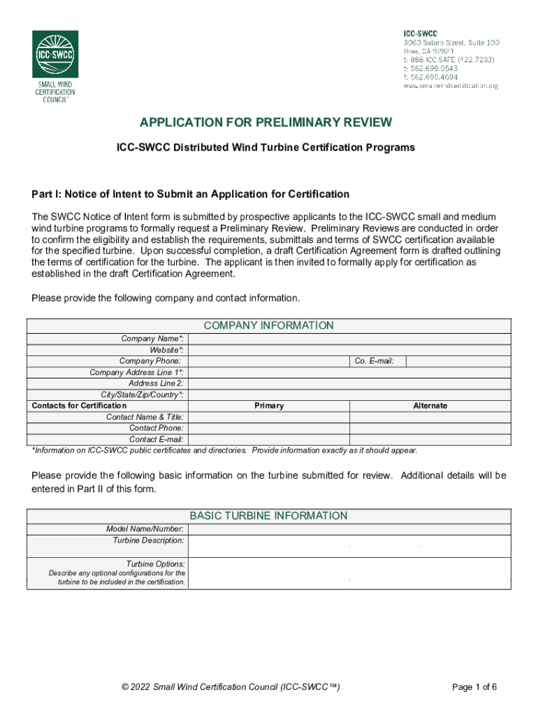 Manufacturers of small wind turbines seeking SWCC certification are required to file ICC-SWCC application for preliminary.