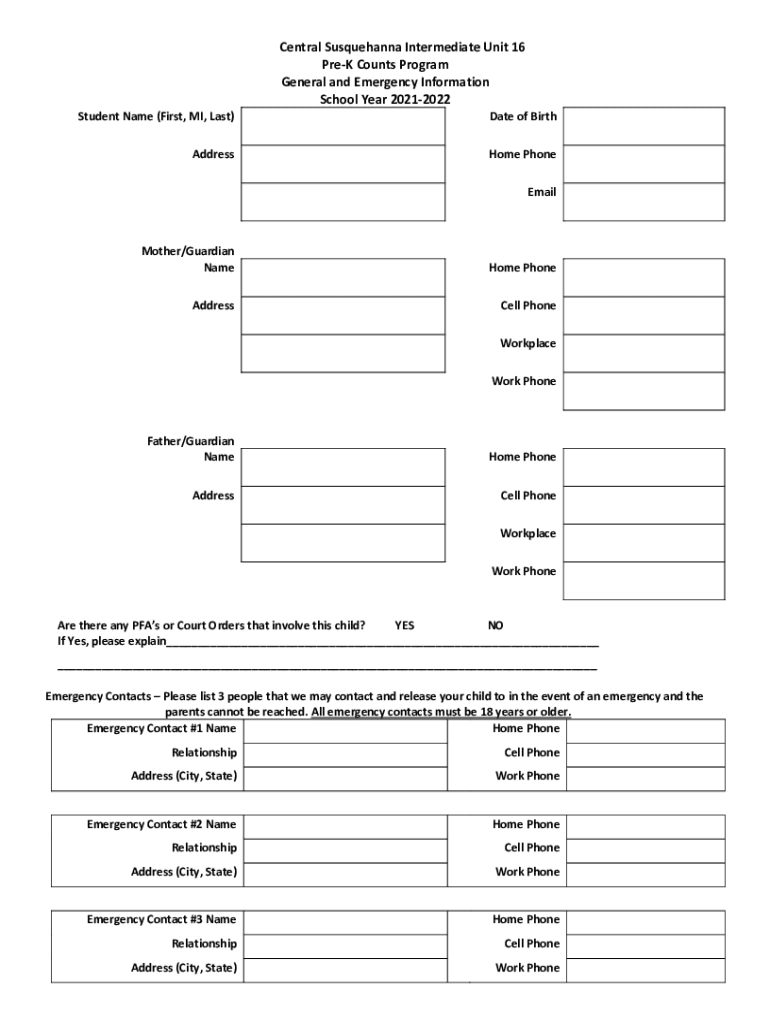 Fill out any new or changed information such as contact numbers, emergency contacts, medical conditions, and medications.