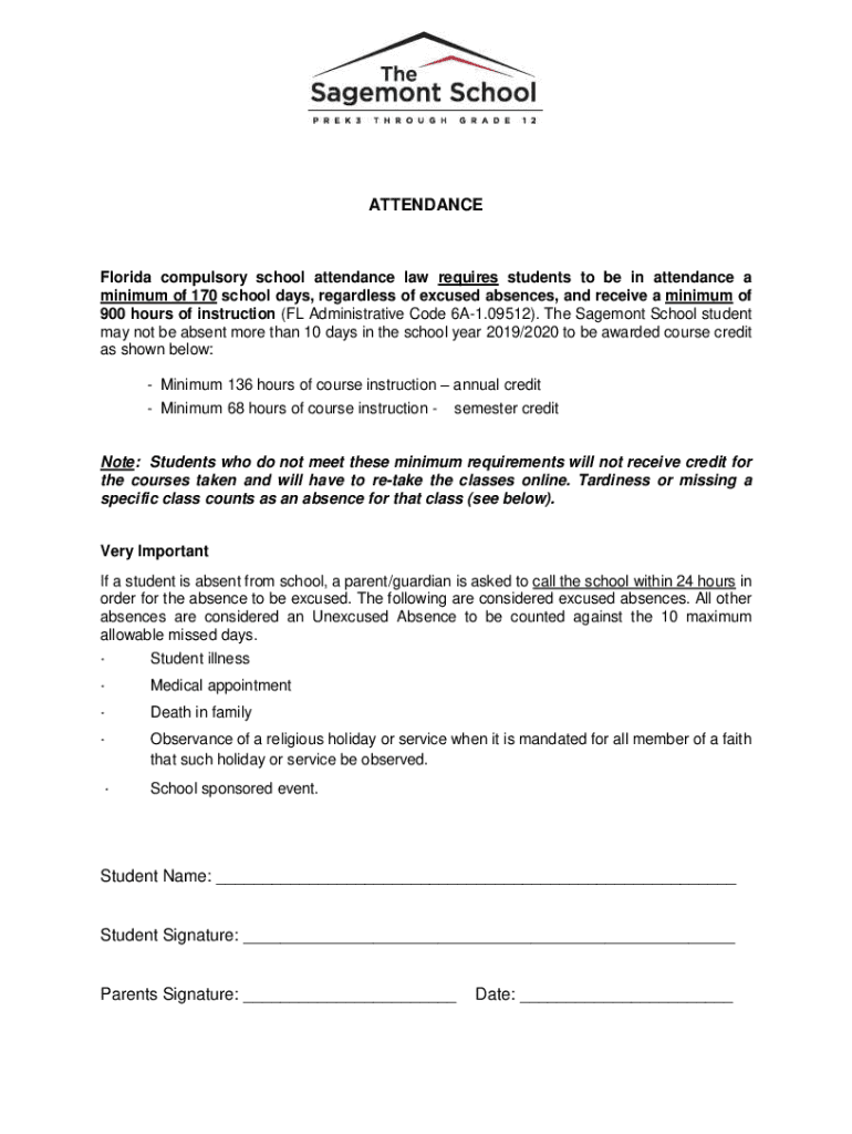 ATTENDANCE Florida compulsory school attendance law requires students to be in attendance a