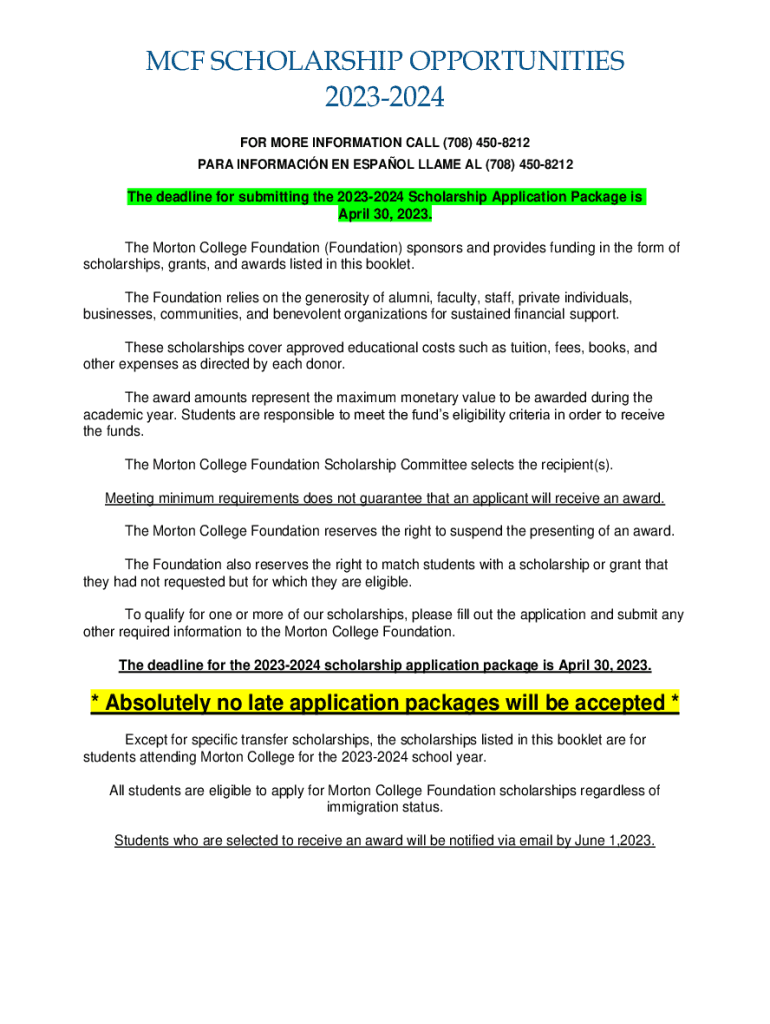 MCF SCHOLARSHIP OPPORTUNITIES 20232024 FOR MORE INFORMATION CALL (708) 4508212 PARA INFORMATION EN ESP AOL BLAME AL (708) 4508212The deadline for submitting the 20232024 Scholarship Application Package