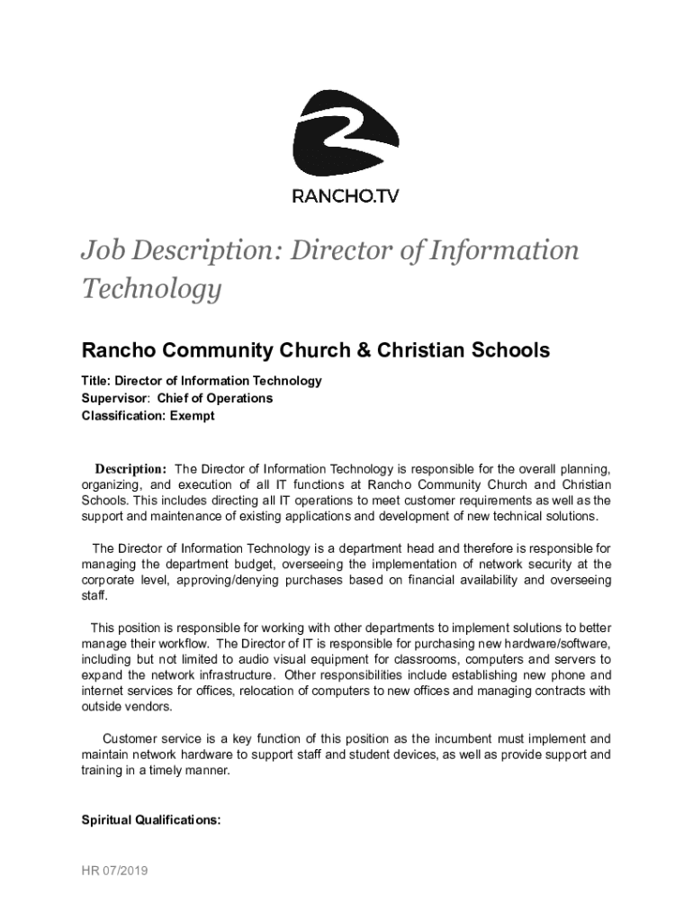 Job Description: Director of Information Technology Rancho Community Church & Christian Schools Title: Director of Information Technology Supervisor: Chief of Operations Classification: ExemptDescription:
