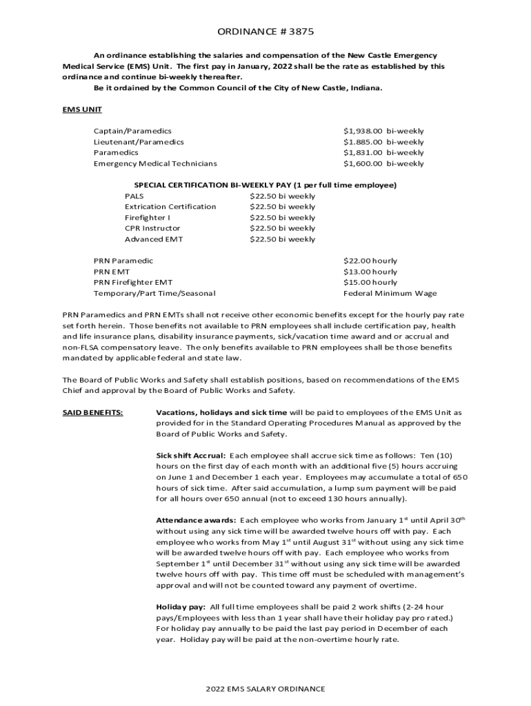ORDINANCE # 3875 An ordinance establishing the salaries and compensation of the New Castle Emergency Medical Service (EMS) Unit. The first pay in January 2022 shall be the rate as established by this