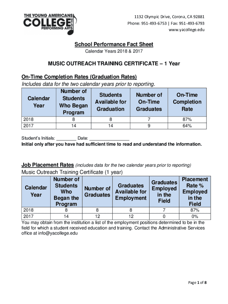 1132 Olympic Drive, Corona, CA 92881 Phone: 9514936753 | Fax: 9514936793 www.yacollege.eduSchool Performance Fact Sheet Calendar Years 2018 & 2017MUSIC OUTREACH TRAINING CERTIFICATE 1 Year Onetime