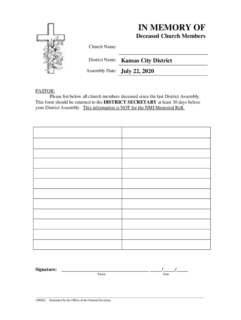 IN MEMORY OF Deceased Church Members Church Name: District Name: Assembly Date:Kansas City District July 22, 2020PASTOR: Please list below all church members deceased since the last District Assembly.