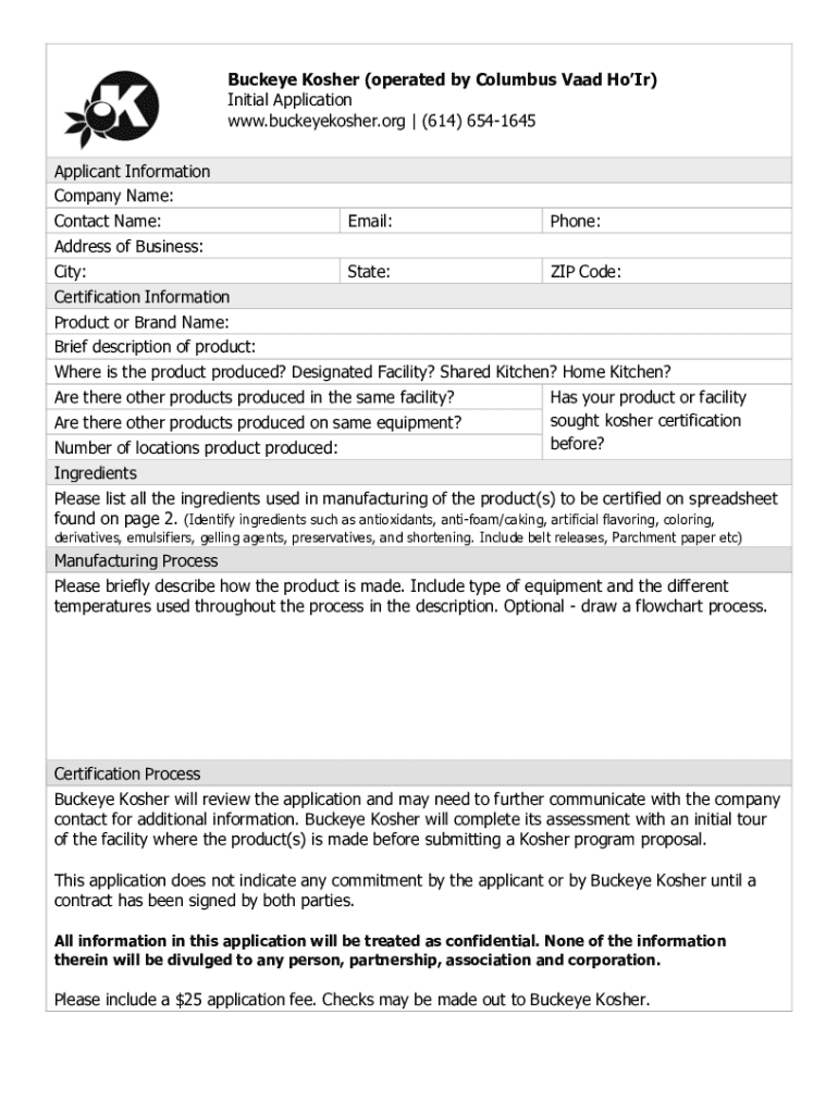Fill out all required fields accurately and completely, including personal information and details about the product or service being certified kosher.