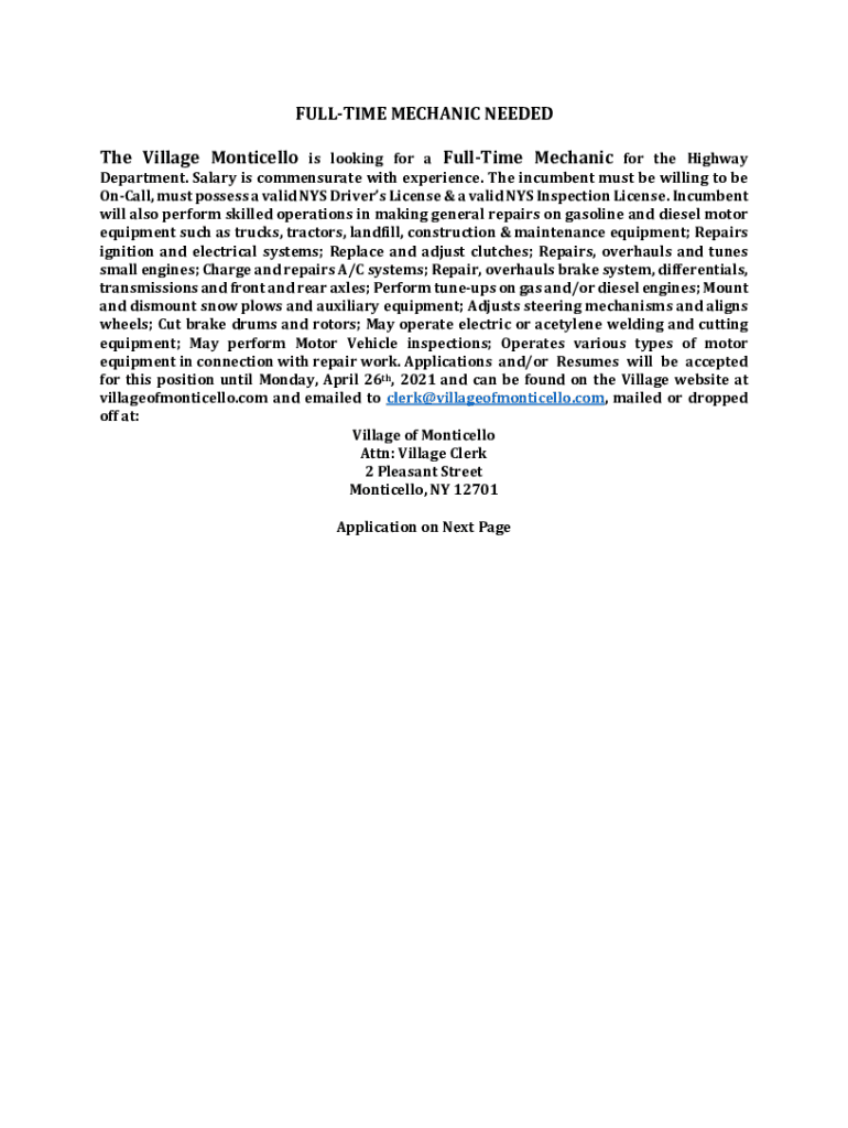 FULL TIME MECHANIC NEEDEDTheVillageMonticelloislookingforaFullTimeMechanicfortheHighwayDepartment. Salary is commensurate with experience. The incumbent must be willing to recall, must possess a valid NYS Driver's