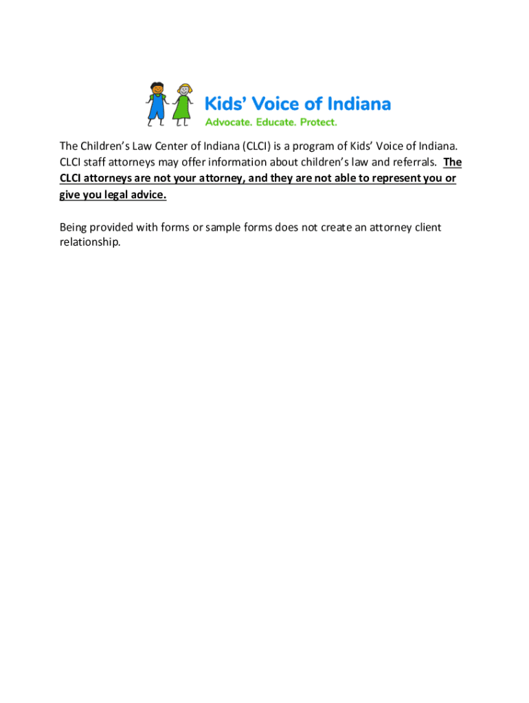 The Children's Law Center of Indiana (CCI) is a program of Kids Voice of Indiana.CCI staff attorneys may offer information about children slaw and referrals. Thence attorneys are not your attorney,