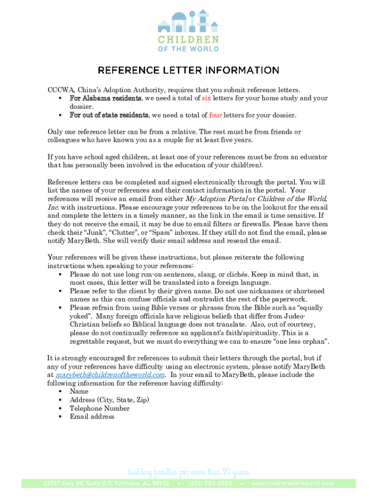 CC CWA, China's Adoption Authority, requires that you submit reference letters. For Alabama residents, we need a total of six letters for your home study and your dossier. For out of state residents,