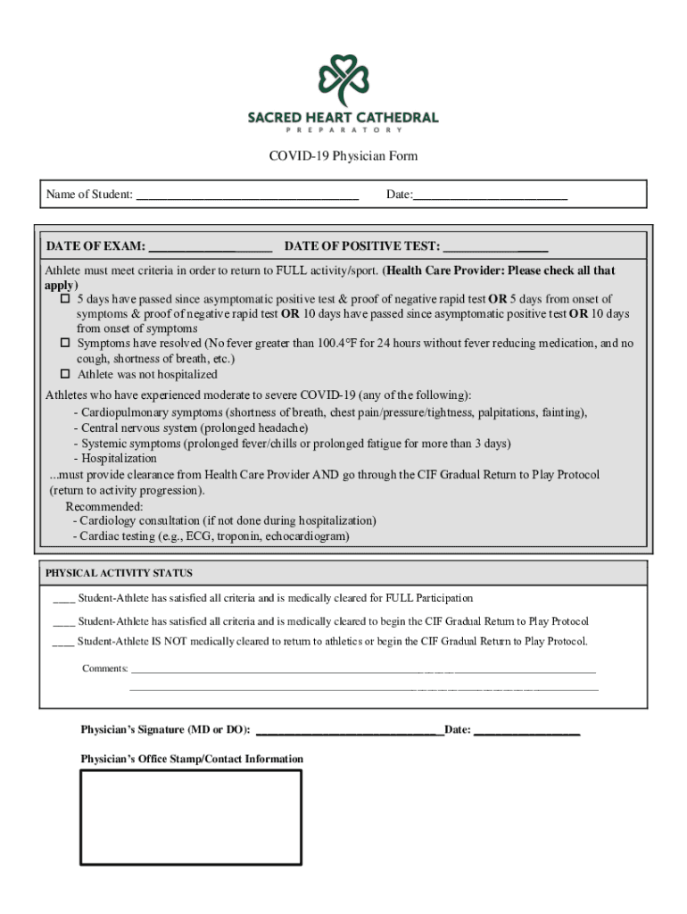 COVID-19 Physician Form Name of Student: ___DATE OF EXAM: ___Date:___DATE OF POSITIVE TEST:___Athlete must meet criteria in order to return to FULL activity/sport. (Health Care Provider: Please check