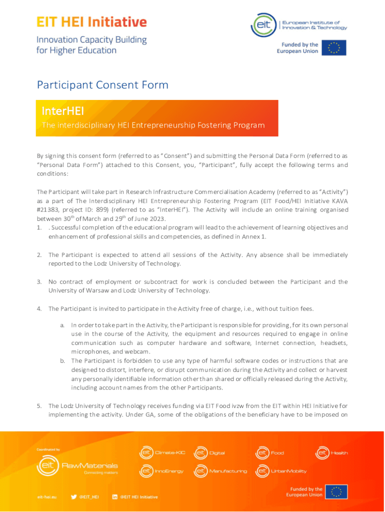 Participant Consent Form Internet The interdisciplinary HE Entrepreneurship Fostering Program signing this consent form (referred to as Consent) and submitting the Personal Data Form (referred to