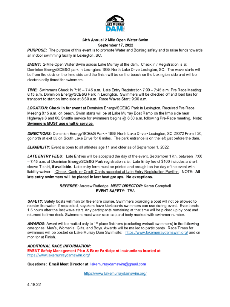 24th Annual 2 Mile Open Water Swim September 17, 2022, PURPOSE: The purpose of this event is to promote Water and Boating safety and to raise funds towards an indoor swimming facility in Lexington,